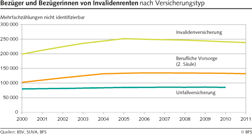 Ende 2011 nahmen 238'333 Personen eine Invalidenrente der IV (exkl. Ehegatten- oder Kinderrente) persönlich in Anspruch. Dies entspricht 4,9% der versicherten Bevölkerung. Weitere 85'080 Invalidenrenten wurden von Unfallversicherungen, 132'139 von Pensionskassen und 2298 von der Militärversicherung bezahlt. Diese Zahlen dürfen nicht addiert werden, da eine Person mehrere Renten beziehen kann (z.B. SUVA + Ergänzung durch die IV).
