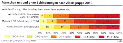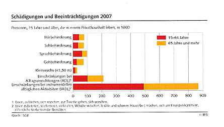 Personen mit Hör-, Seh-, Sprach- oder Gehbehinderung sowie kleinwüchsige Personen sind in der ständigen Wohnbevölkerung anteilsmässig nur gering vertreten. Ihr Anteil liegt häufig unter 1%, wenn ausschliesslich die Bevölkerung im erwerbsfähigen Alter (15- bis 64-Jährige) berücksichtigt wird. Am häufigsten (insbesondere im Pensionsalter) treten Behinderungen auf, die zu Einschränkungen bei grundlegenden Alltagsverrichtungen (ADL*: essen, aufstehen, sich anziehen, zur Toilette gehen, sich waschen) oder bei instrumentellen alltäglichen Aktivitäten (IADL*: Essen zubereiten, telefonieren, einkaufen, Wäschen waschen, leichte und schwere Hausarbeit machen, sich um Finanzen kümmern, öffentliche Verkehrsmittel benützen) führen.